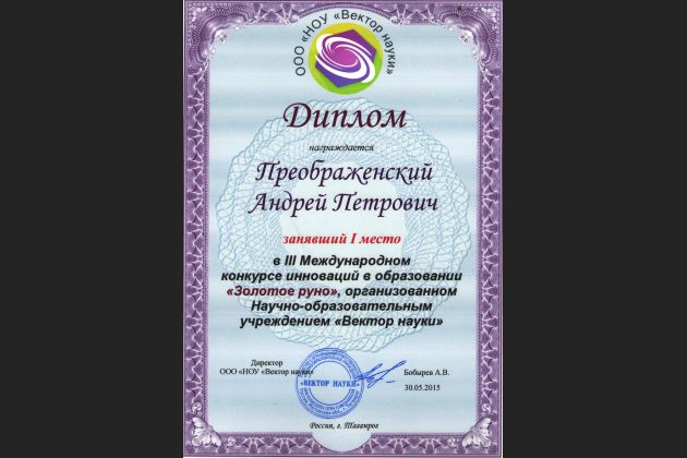 Преподаватель ВИВТ Преображенский Андрей Петрович с работой, посвященной исследованию инновационных процессов в образовании, занял I место, за что был награжден дипломом и медалью. Материалы исследований участников конкурса были опубликованы в сборнике научных трудов Международной конференции «Социально-педагогические инновации в современном образовании».
